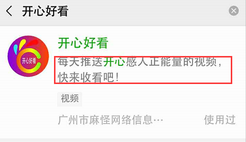 我们先来看看“开心好看”小程序的初始页面,上面有这么一句话:每天推送开心感人的正能量的视频,快来收看吧!这里有三个关键词:开心!感人!正能量!在未进入主页面前,因为这三个词,已经产生了轻微的动机。