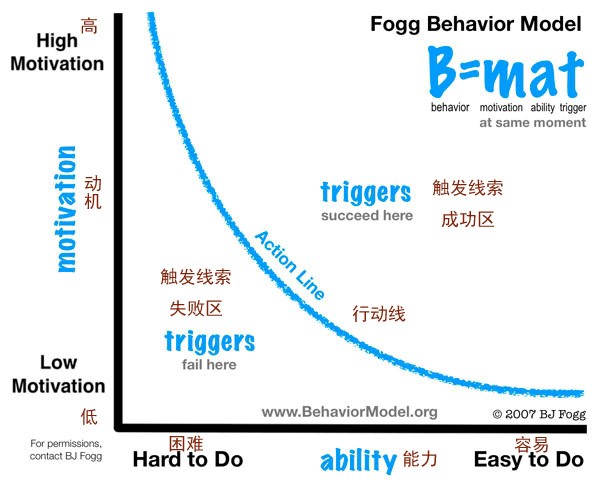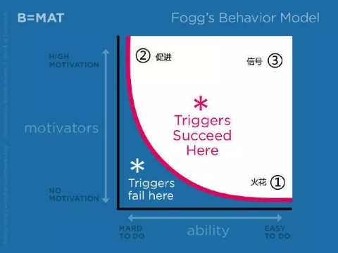 从这张图上我们可以看出,纵坐标为动机,下方是低的动机,上方是高的动机,横坐标为能力,左边需要的能力高,右边需要的能力低。图中的这条曲线叫行为成功曲线,曲线及曲线上方是行为成功区,在这块区域里触发是有效的;曲线下方就是行为失败区,这个区域里触发是无效的,不会发生任何行为。