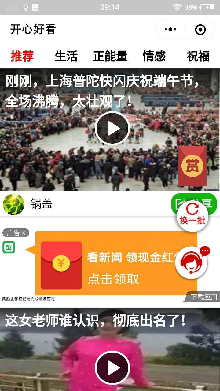 通过观看“开心好看”的视频,我发现分类其实并不十分明确,其中最多的就是一些搞笑视频、鸡汤视频,不同于抖音的短视频的60秒内,有点类似今日头条pc端的西瓜视频,但种类上要少很多。若是不喜欢第一眼所见页面的视频,还能通过点击右边的“换一批”按钮来实现换片。