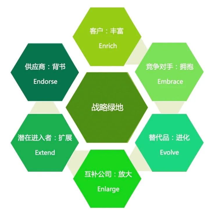 所以,我们提出了战略绿地的理念,试图让经营理念从传统的红海竞争或寻找蓝海战略转向绿地的协作。将五力模型中的威胁转化为可以互相帮助的资源,产生协同效应。真正实现战略绿地,需要从根本上改变我们的认知。