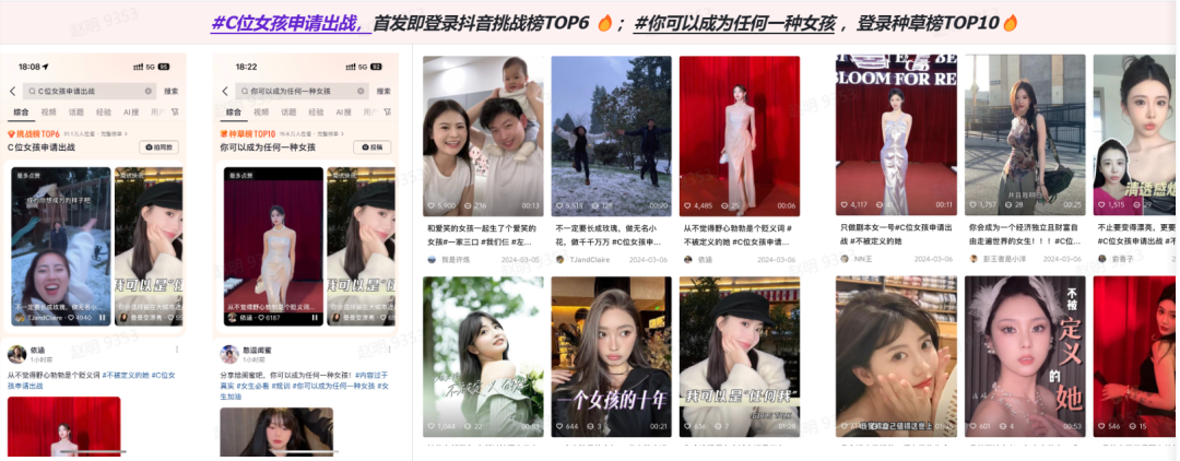 与此同时在抖音站内,巨量星图打造#C位女孩申请出战 热点冲榜,联合头部达人释放励志爆改成长故事,鼓励女孩打破定义勇敢做自己,让品牌更好的出圈。