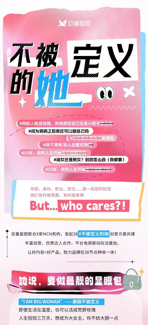 比如笔者留意到今年三八妇女节,达人不再是营销的配角,而是成为品牌营销的主角。巨量星图发起三八妇女节节点IP#不被定义的她 主题,联合MCN机构、1200+达人以及多达117家品牌,放大三八妇女节内容创意影响力,最终实现全网曝光量13亿+,真正用好内容助攻好生意,让我们看见达人在品牌节日营销发挥的新势能。
