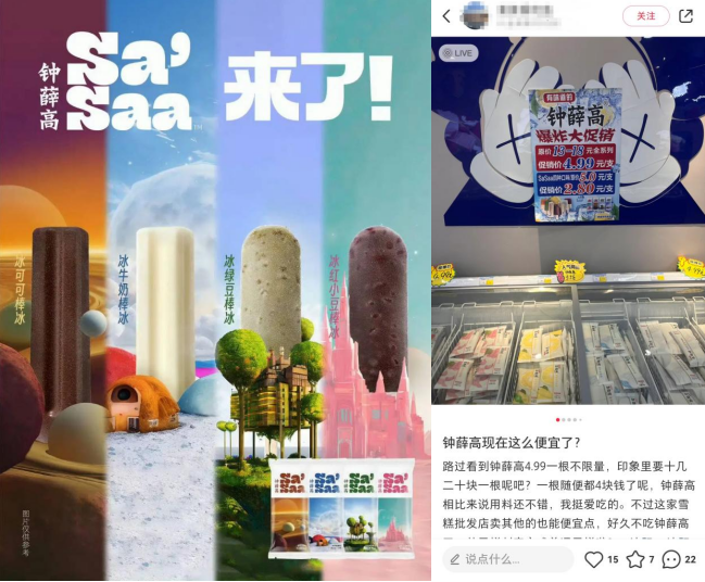 然而好景不长,关于“钟薛高是雪糕刺客”“31°C室温放一个小时不融化”“钟薛高雪糕烧不化”“钟薛高实际成本很低”等诸多话题,也让这个品牌陷入用户的质疑声中。在资本集体撤退、新消费品牌狂奔时代彻底落幕后,钟薛高一再降价——品牌在去年4月推出了低价雪糕产品“Sasaa”,但由于口味太平常了,在同价位的雪糕中没有丝毫竞争力。而临期的普通雪糕最低也卖到了2.5元一根,超高的价格差距,进一步降低了消费者的好感和购买欲。