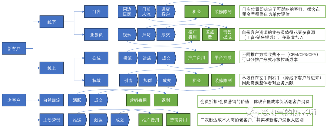 获客渠道有很多种,但考核的目标是统一的:尽可能低成本地找到有需求客户,尽可能让新用户成交/老用户复购。不同渠道,有不同的业务逻辑,因此要分开考核效果(如下图)。