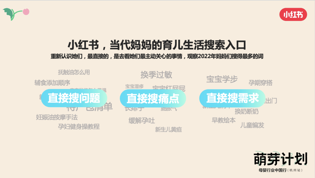 作为新搜索入口,根据小红书平台公布数据可看到“问题、痛点、需求”的相关搜索词,在妈妈们的搜索框高频出现,母婴搜索年度增长70%、母婴内容年度增长86%。