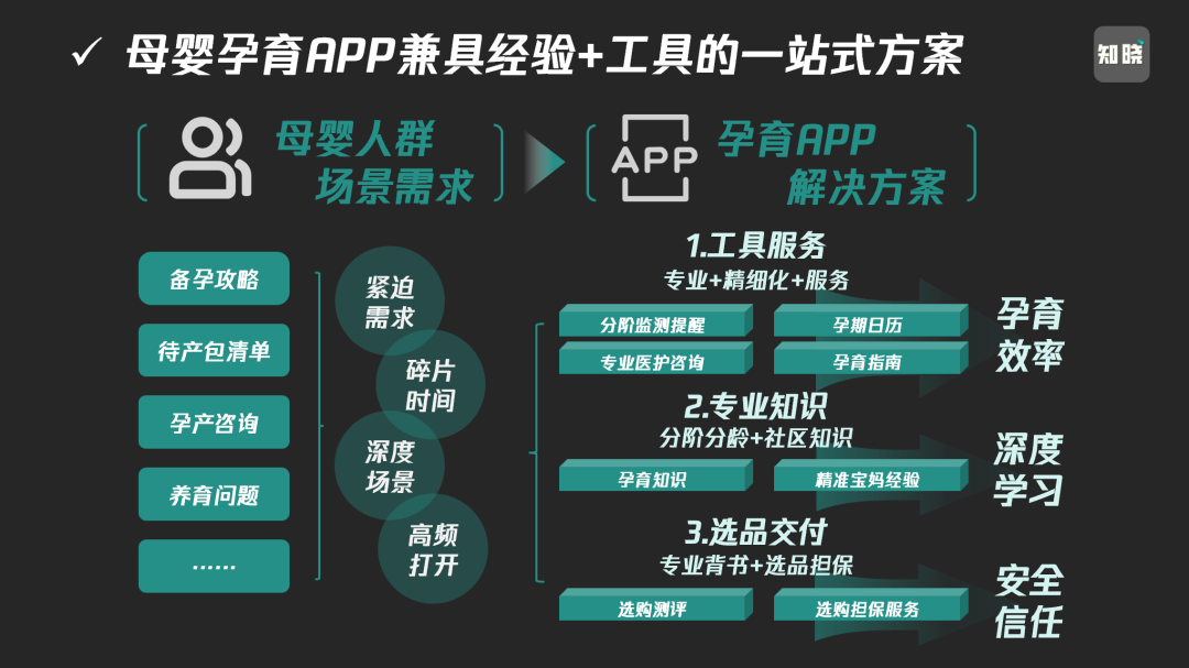 母婴垂媒类提供的“备孕产育专业知识”+“在线问诊工具服务”+“同阶段的妈妈分享”,在孕育旅程特殊性阶段,带给他们更集聚的信息、工具、服务。