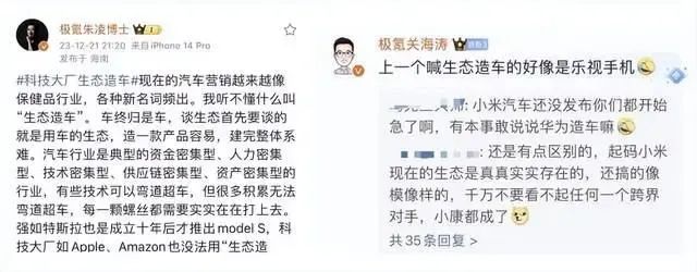 在舆论战上,极氪全力“围剿”还没上市的小米汽车。去年小米汽车发布会期间,赵春林、朱凌和关海涛就一起在微博嘲讽小米“生态造车”的宣传语。当小米包下 5 块地标大屏致敬友商,没包含吉利,杨学良也颇有失态,连发多条微博表达不满。今年 2 月极氪发布会上,副总裁林金文更是毫不客气:“营销上极氪要向小米学习,技术和产品上小米要向极氪学习。”