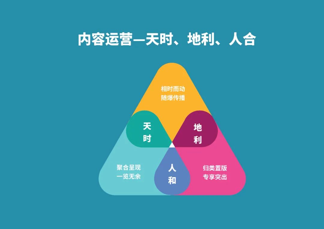 我们在浏览网站或使用APP时,不难发现页面时常会经历改版。这些变化可能涉及页面风格的调整、版块的增减等,都是内容运营中不可或缺的内容整合环节。尽管版面风格多变,版块设置丰富多样,但这些变化并非随意而为,它们遵循着一种深层次的规律——即内容整合的“天时地利人和”模型。这一模型确保了每一次改版都能顺应市场趋势、发挥平台优势,并满足用户的实际需求。