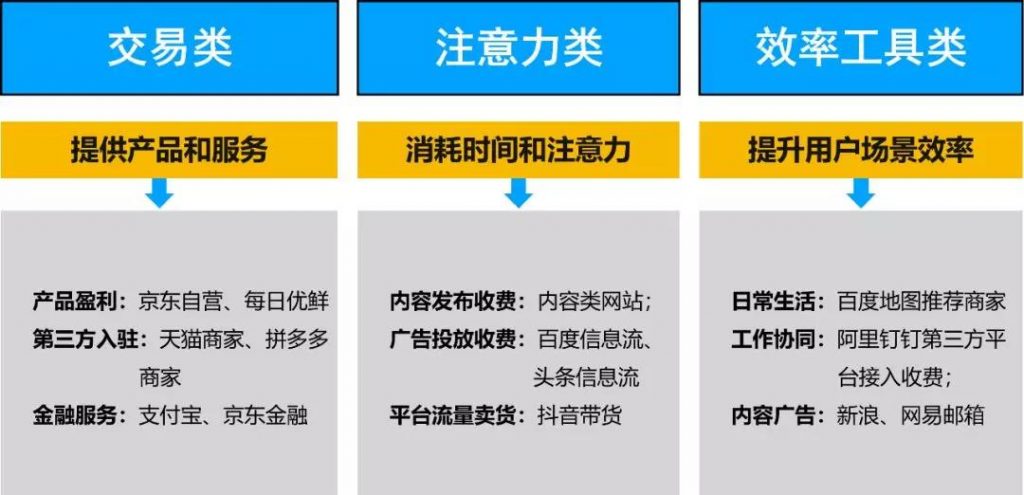 效率类产品:效率类产品多应用于工作场景,比如邮箱、协同软件等,都是为了提供用户在单一场景下的工作或执行效率而产生的,主要商业模式是通过订阅制等各种方式进行获利。比如办公协同软件钉钉、数据分析平台易观方舟等。