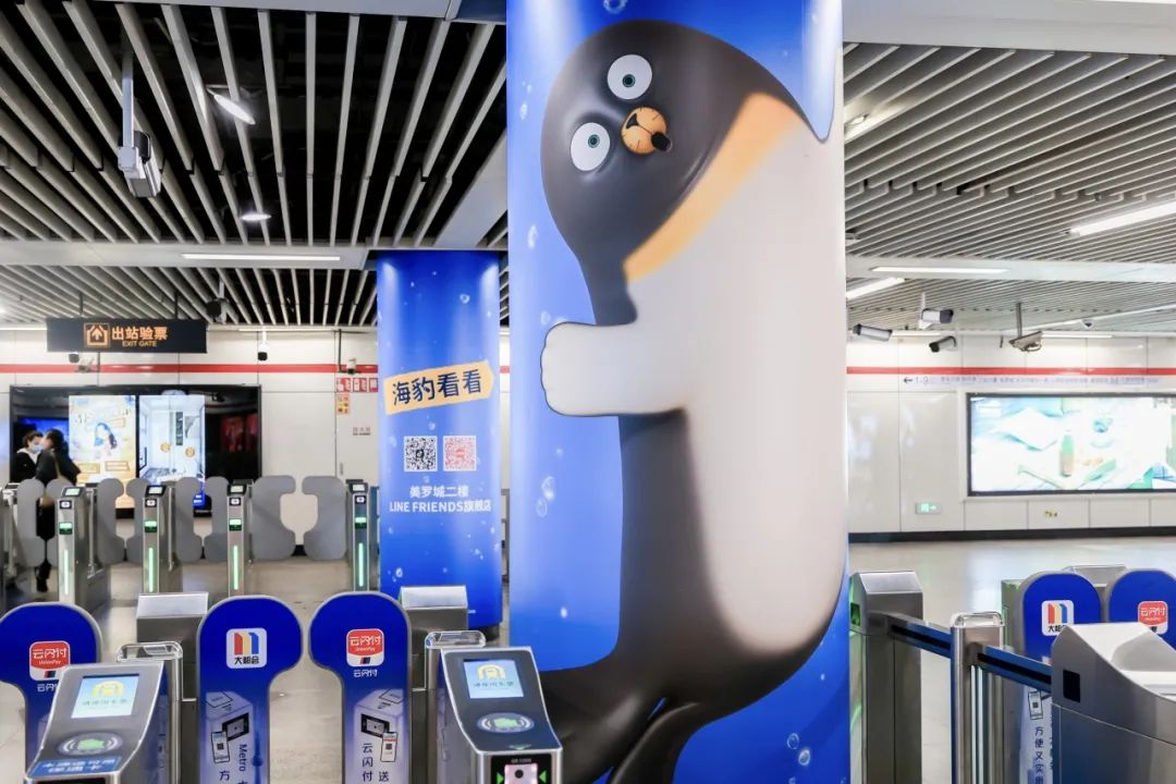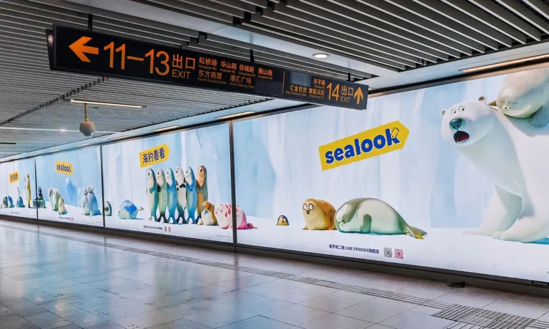 从创意到生意的道路上,LINE FRIENDS基于《海豹看看》搞笑、治愈的特点属性,紧跟当下社交语境中的热点话题以快速切中年轻人、亲子家庭等核心圈层受众,惊喜入驻上海徐家汇地铁站、美罗城水晶球灯等户外场域打透场景,于无形之中与消费者拉近沟通距离、占领广泛圈层人群心智。而这每一次大众刷脸、引发共鸣的背后,都是LINE FRIENDS对其品牌“陪伴”价值的深化。