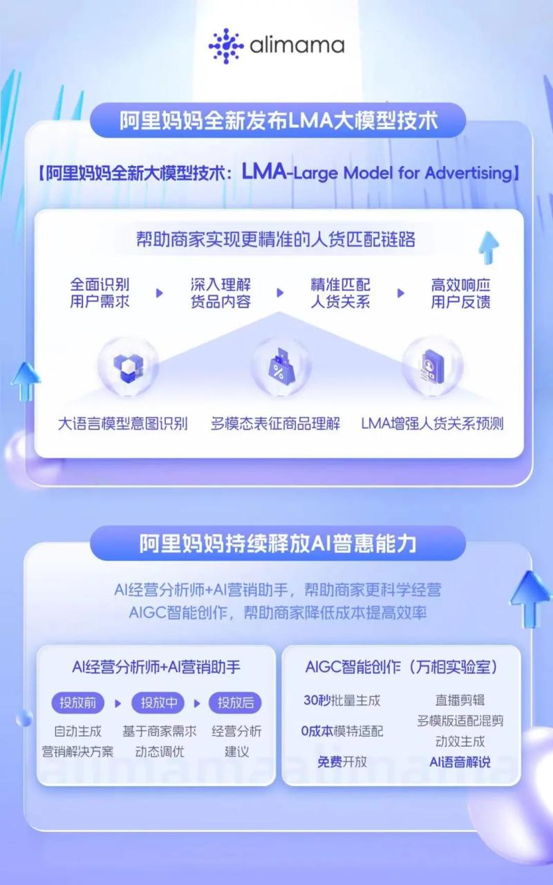 实际上,无论电商如何迭代,核心都是高效的人货匹配。因为只有当“消费人群的真实需求”与“商家的优质供给”相结合,一切增长才得以成为可能。阿里妈妈发布LMA大模型技术(Large Model for Advertising),其目的就在于以AI技术实现人货匹配,并比传统电商更简单、精准。