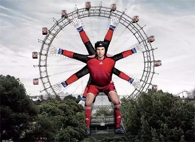 这是阿迪达斯为了庆祝2008年的欧洲杯开幕,在欧洲杯期间建造一个“一头八臂的捷克门将Petr Cech”,身高为60米摩天轮巨型广告,在视觉上很有冲击力。