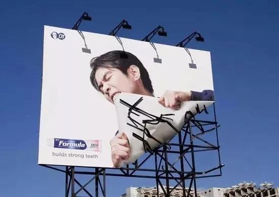 牙膏广告,怎么玩创意?看完这个品牌,你就懂了!使用这款牙膏,就连户外广告牌都可以咬动,你说这款牙膏好不好呢?