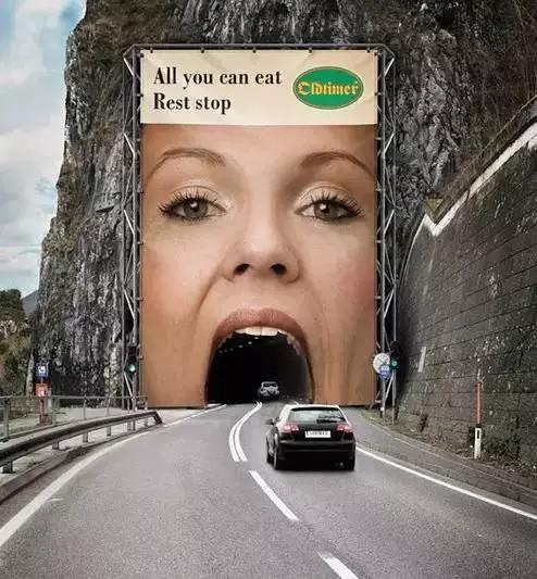 一般户外广告,都是设置在高架上,这家餐厅玩出了新花样,把广告设计在隧道口上。不过话又说回来,开车进入这个隧道的时候,有点怪吓人的。