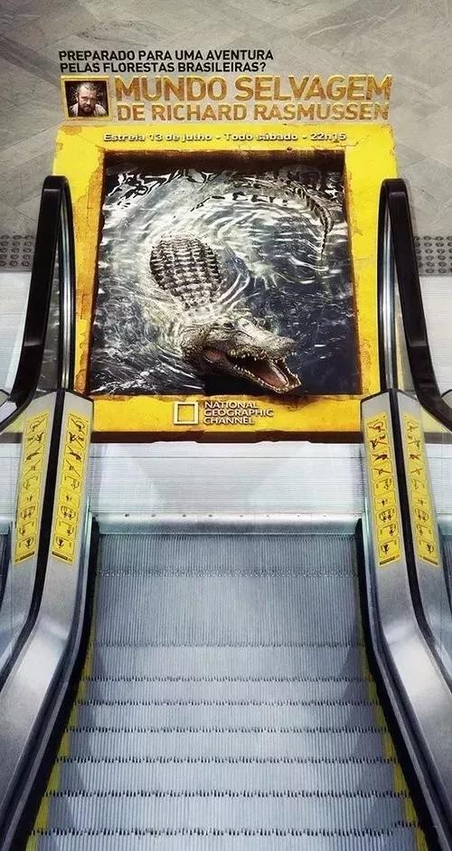 国家地理利用3D视觉广告,效果十分的逼真!还特意设计在下行扶梯口,让人第一眼看到心惊胆战,自然也就记住了国家地理的特色了,这招实在是高!