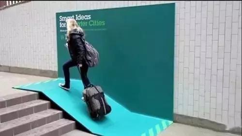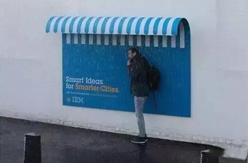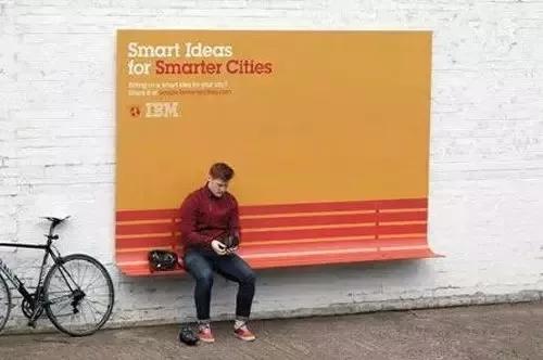 IBM智慧地球把广告牌很巧妙地融合为人们生活中的一部分,比如楼梯处的斜坡广告牌为提行李箱的人们提供便利、可以变身凳子的广告牌、可以遮雨的雨棚广告牌……