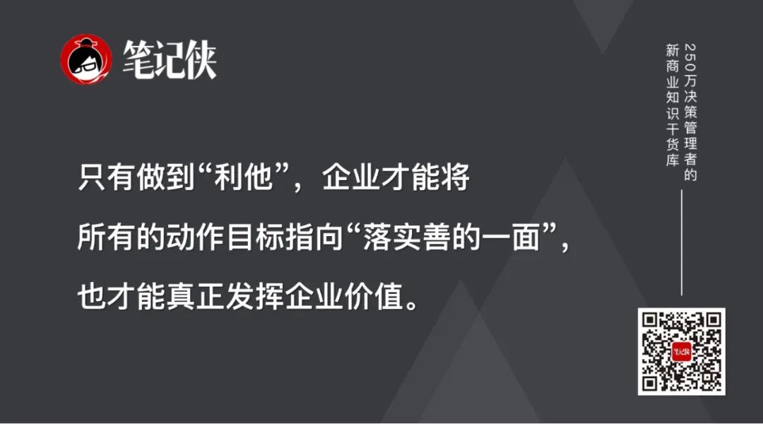 因为只有做到“利他”,企业才能将所有的动作目标指向“落实善的一面”,也才能真正发挥企业价值,从而将企业责任和社会进步结合到一起,企业的发展才能稳定。