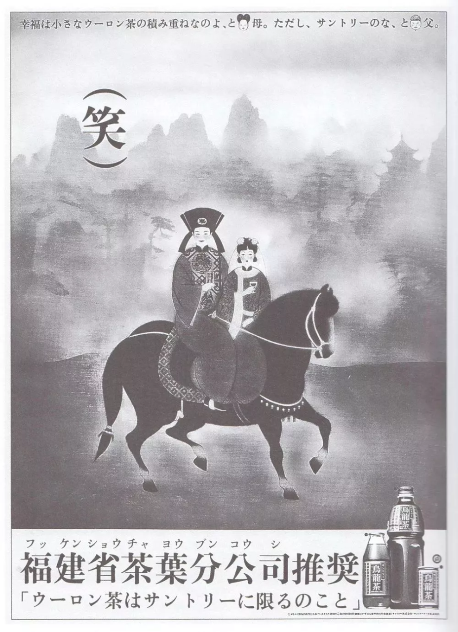 在三得利乌龙茶早期的广告中,品牌采用了中国传统绘画的人物形象作为海报的主要元素。这种直观的文化符号让顾客能够立即感受到茶文化的悠久历史和传统文人雅士的饮茶美学,从而在消费者心中树立起品牌与传统中国茶文化的紧密联系。