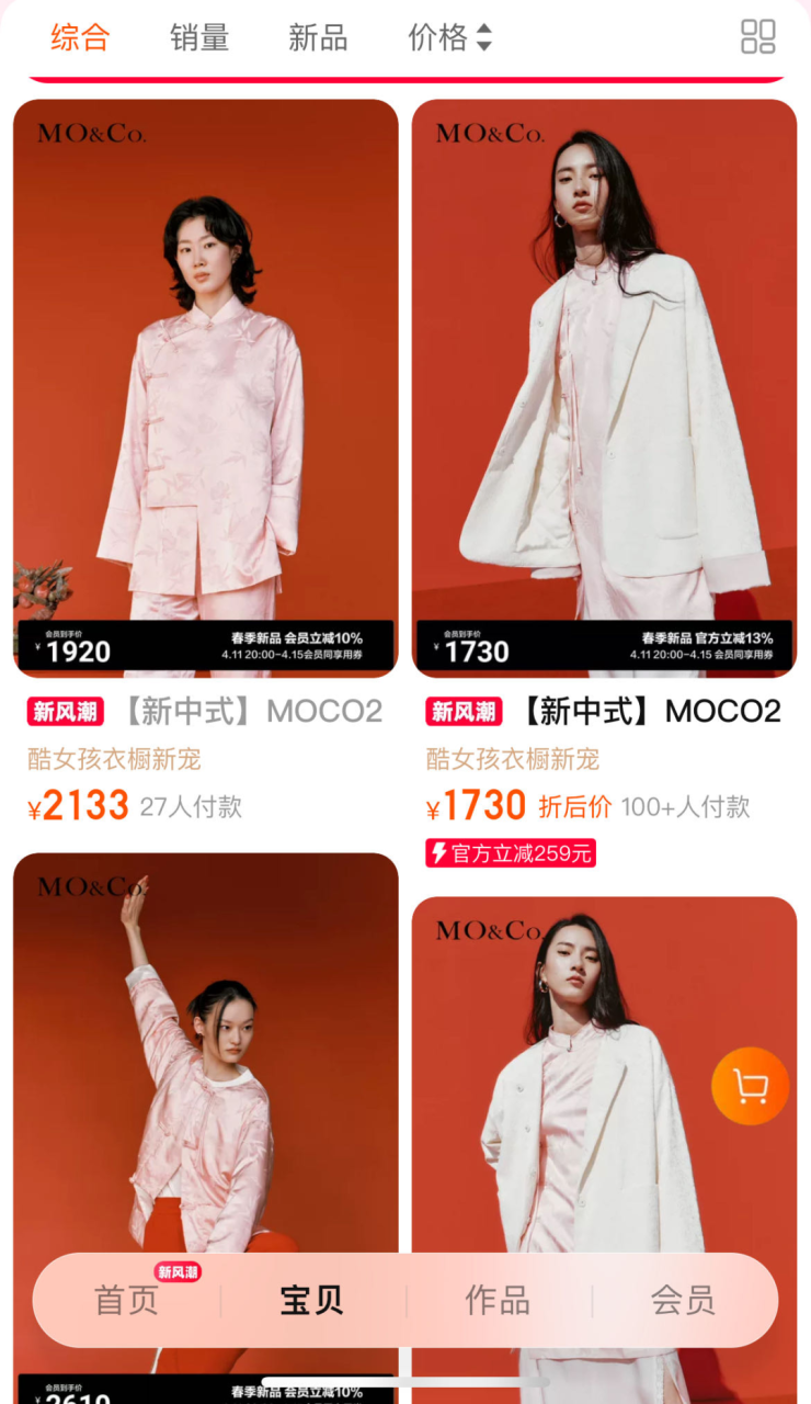 MO&Co.在2024年推出的“桃粉新年”新中式系列,同样展现了新中式产品设计的创新和吸引力。该系列在天猫旗舰店首页占据了显著位置,并在线下门店中被特别展示。产品采用了桑蚕丝面料,设计上融入了桃花和竹子等传统元素,传递出春暖花开的美好意象。新中式的新品,也将MO&Co.的价格推升至2000元上下。
