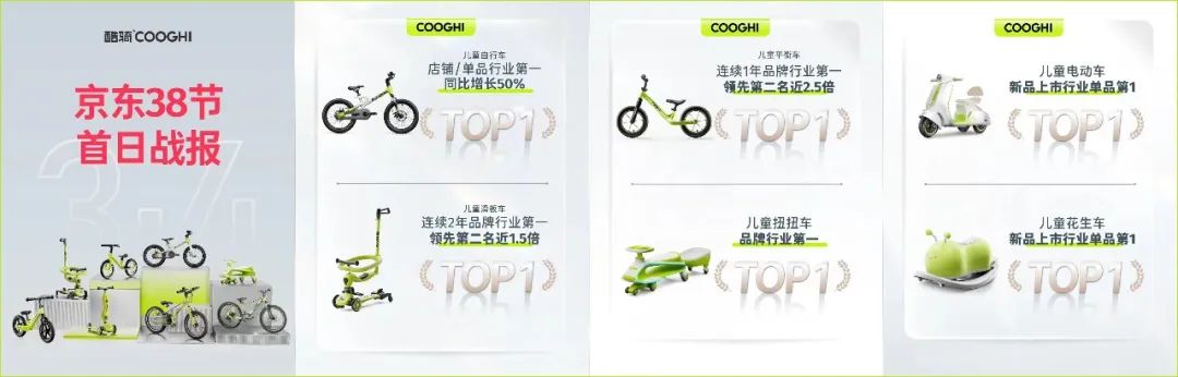 酷骑通过观察用户需求不断迭代产品,将产品覆盖人群从小童到了年轻人,还被沙利文认证为“多功能滑板车开创者”等称号。目前,酷骑旗下的儿童自行车、儿童滑板车、儿童平衡车等产品稳居类目热销榜TOP1。
