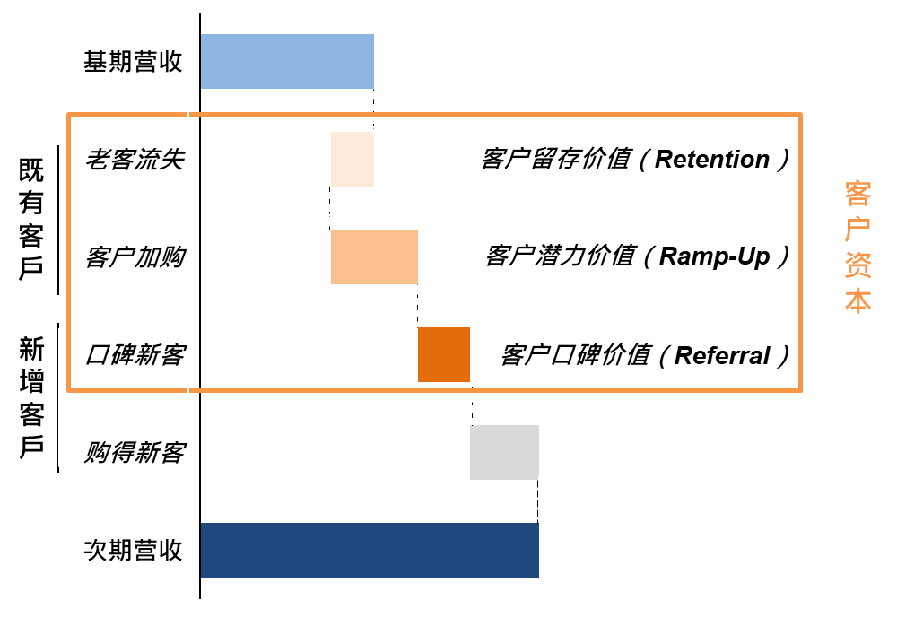 客户资本可以用三个关键的客户价值维度(3R)衡量:客户留存价值(Retention)、客户潜力价值(Ramp-up)和客户口碑价值(Referral)。