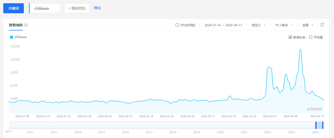 据百度指数显示,Chiikawa在今年4月的搜索量,不断刷新着记录。