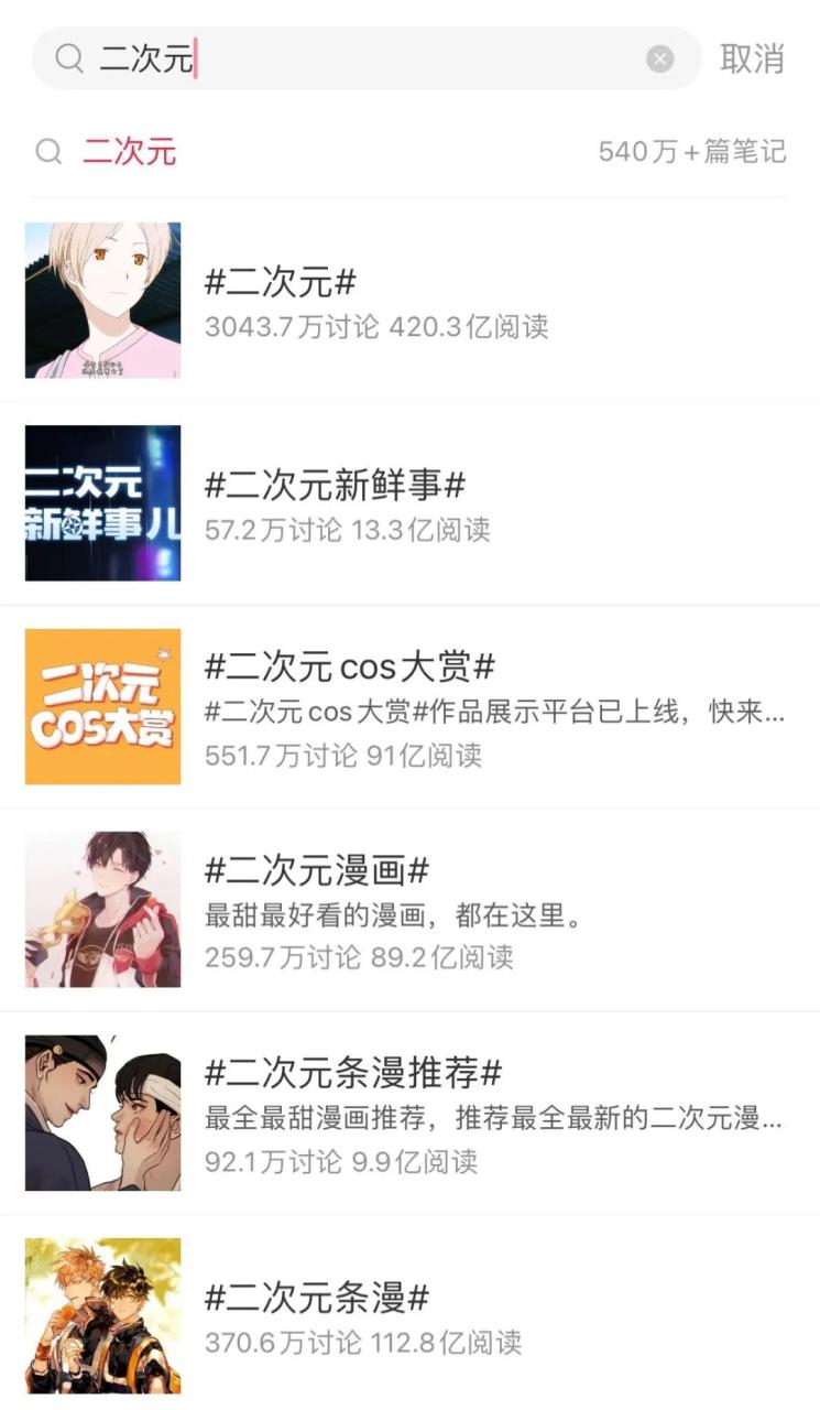 从各平台的数据看,目前新世代新语言也是颇受欢迎的。在小红书上,关于二次元的笔记,超过了540万+篇。在微博上,关于二次元的话题阅读超过了420亿,可见其受欢迎的程度。