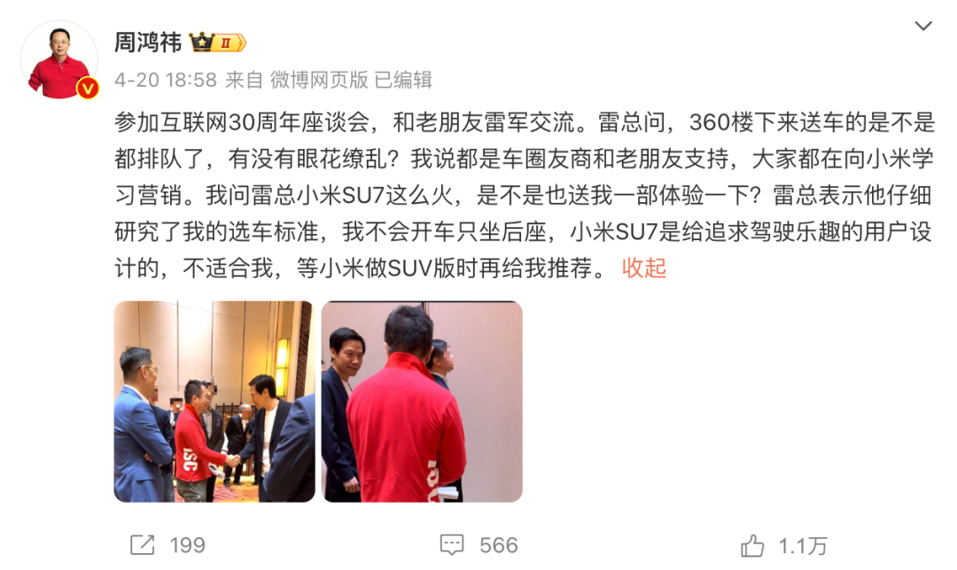 最近,在纪念互联网30周年的座谈会上,发生了一件趣事:周鸿祎向雷军索要一辆新车体验,而雷军则以幽默的方式婉拒了这一请求。