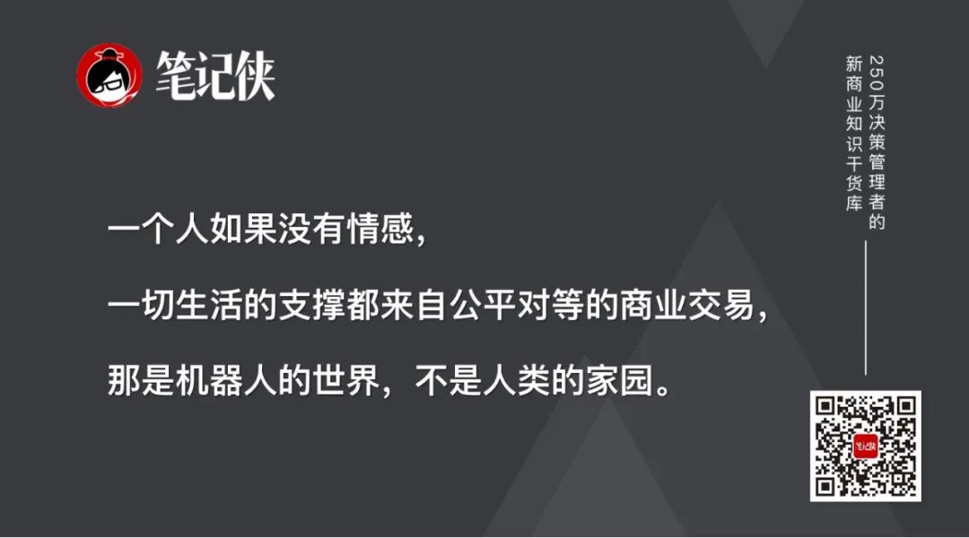 但是一个人如果没有情感,一切生活的支撑都来自公平对等的商业交易,那是机器人的世界,不是人类的家园。