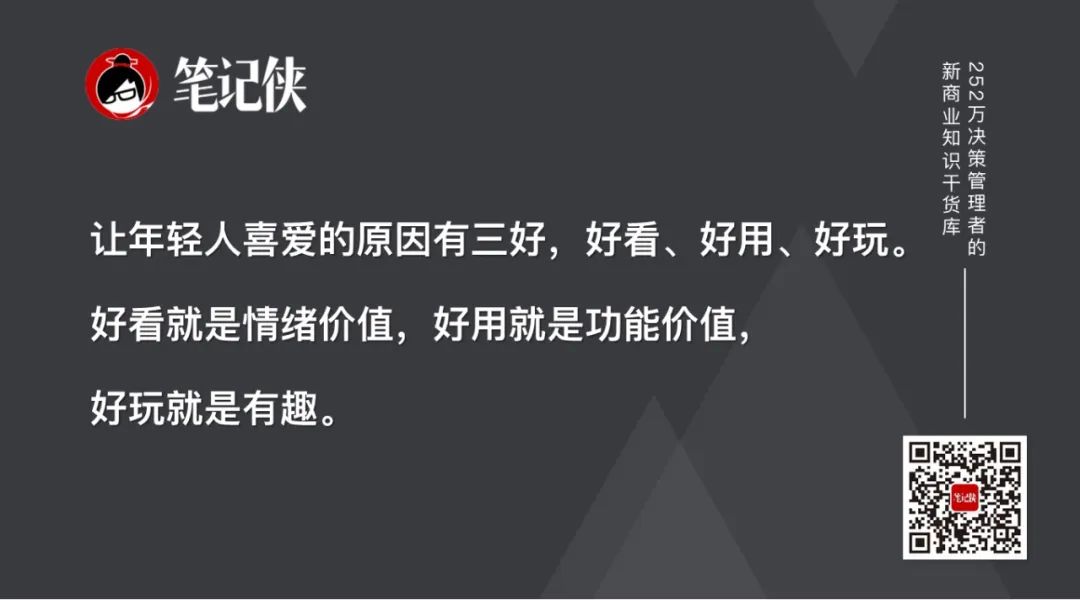 让年轻人喜爱的原因有三好,好看、好用、好玩。好看就是情绪价值,好用就是功能价值,好玩就是有趣。”