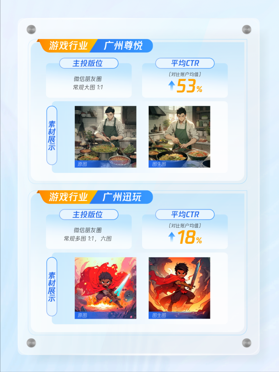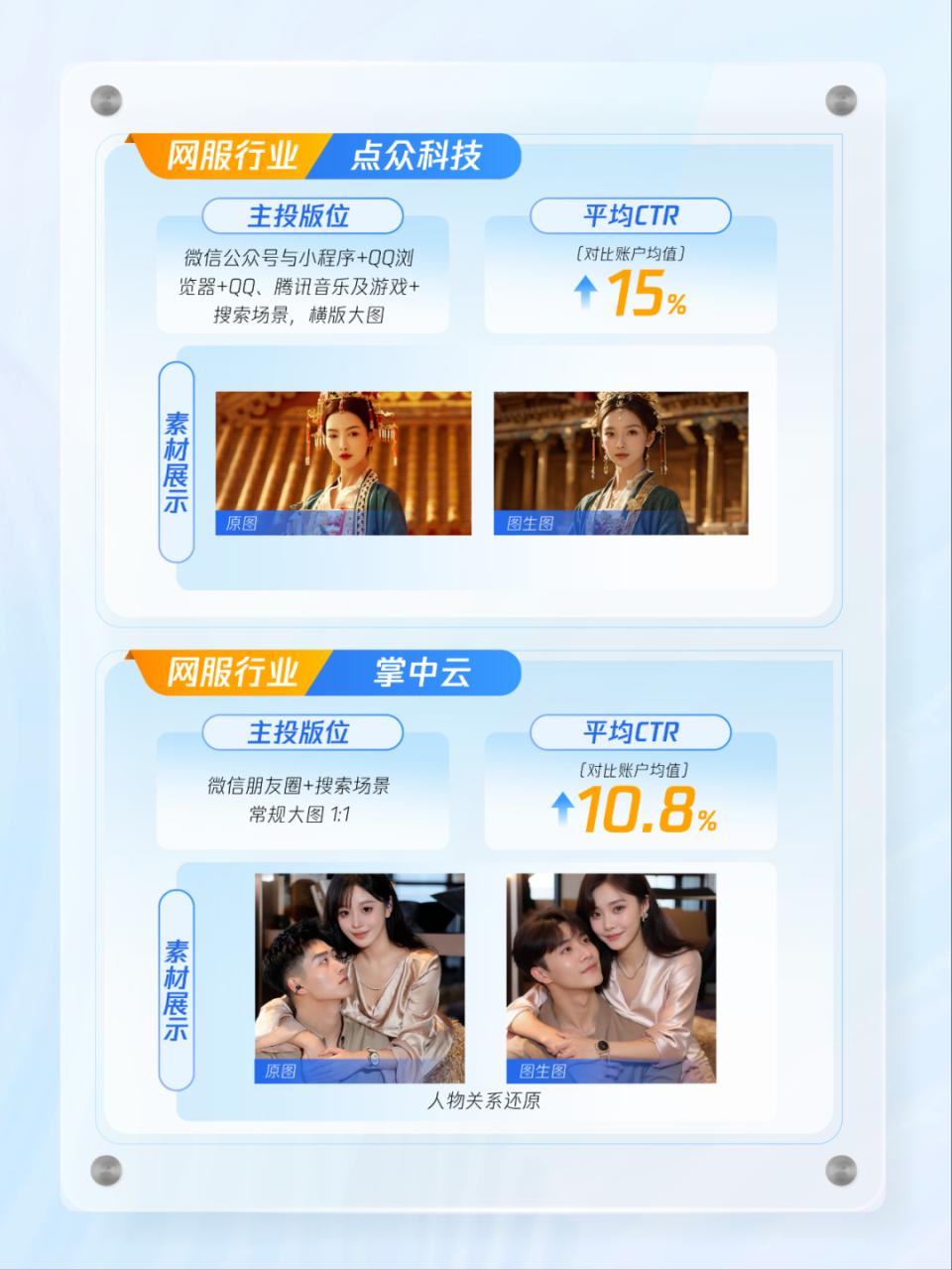 虽然在各大平台上,已经有不少关于AIGC的体验与科普。只是对于那些不够了解AI,不知道怎么选择平台,也不知道如何将AI应用到自己生意当中的商家来说,没有太多全链路、可实操、可借鉴的案例。最近,基于混元大模型的一站式AI广告创意平台腾讯广告妙思,就上线了能让CTR+15%的“图生图”能力。我们不妨以这些借科技优化投放的案例为引,给大家提供一些直观的参考意见。