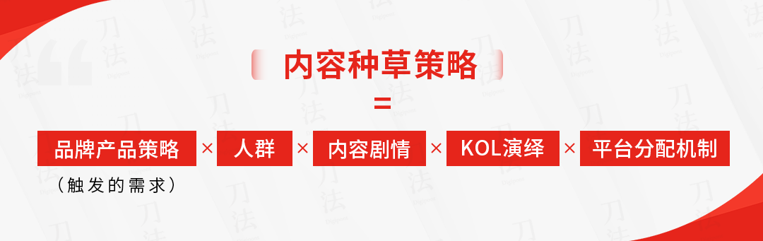 内容种草策略 = 品牌产品策略(触发的需求)* 人群 * 内容剧情 * KOL演绎 * 平台算法机制