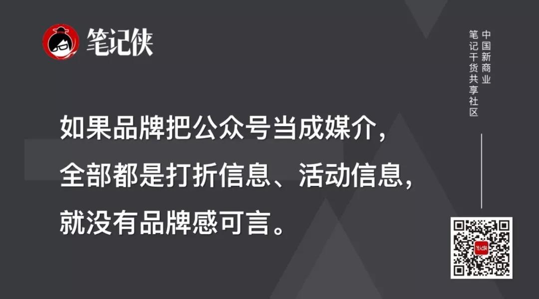 公众号是非常重要的文化传输载体。如果品牌把公众号当成媒介,全部都是打折信息、活动信息,就没有品牌感可言。