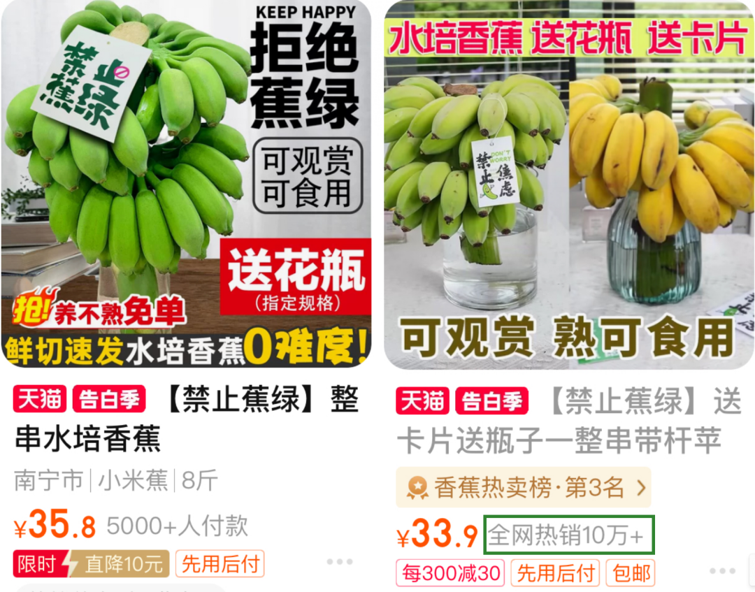 在电商平台上,搜索“水培香蕉”、“禁止蕉绿香蕉”等关键词,可以发现产品成交量破万的店铺比比皆是,还有店铺最近热销产品竟高达10万+件。