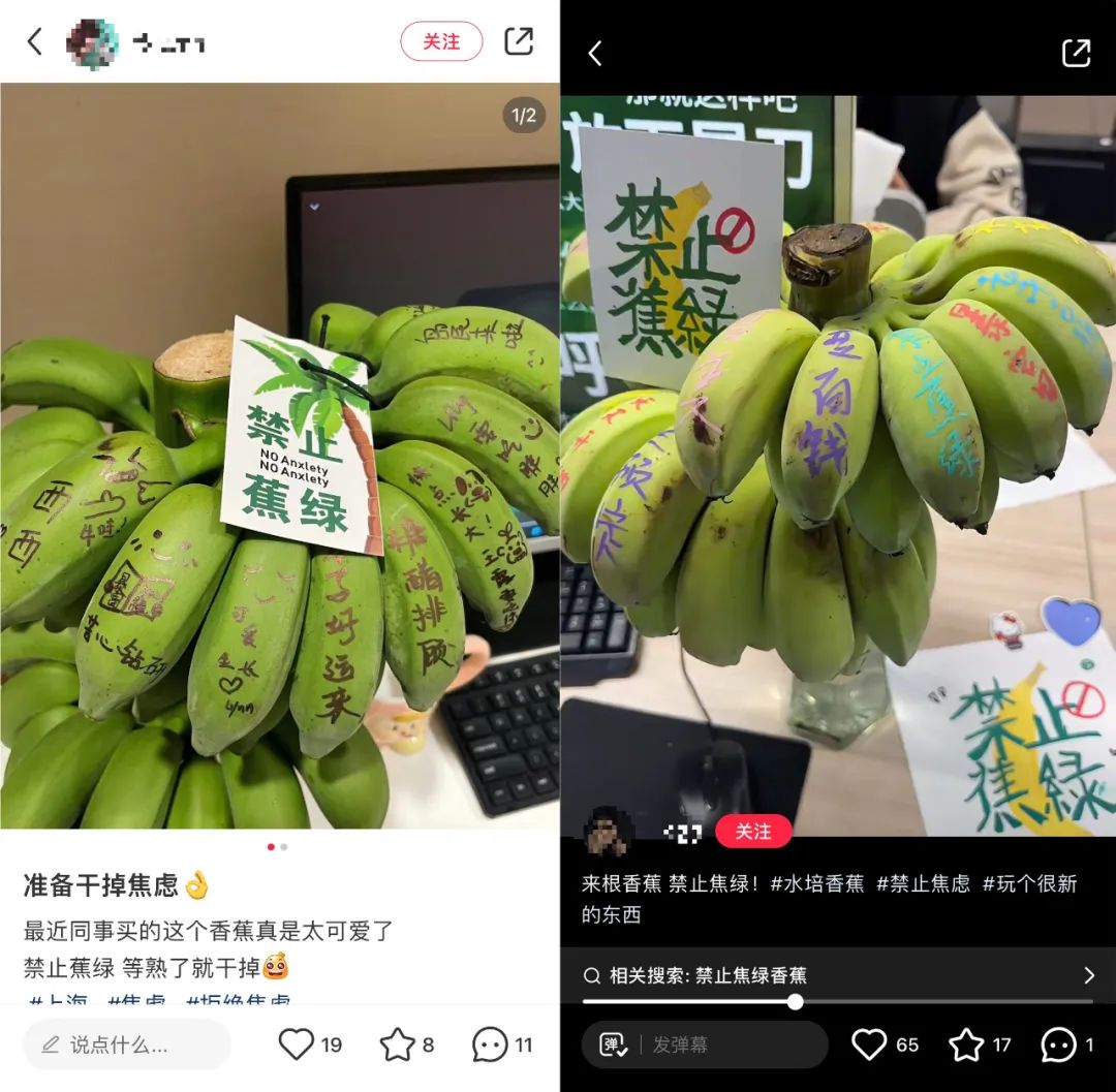 焦虑是一个看不见摸不着的东西,现在打工人办公室标配的绿植,将「禁止蕉绿」以工牌、文字的形式出现,让打工人内心深处拒绝焦虑的想法实现了具象化的表达,产生了“蕉虑(绿)散去”、静待“蕉黄”的积极心理暗示,也让拒他们绝精神内耗有了仪式感。