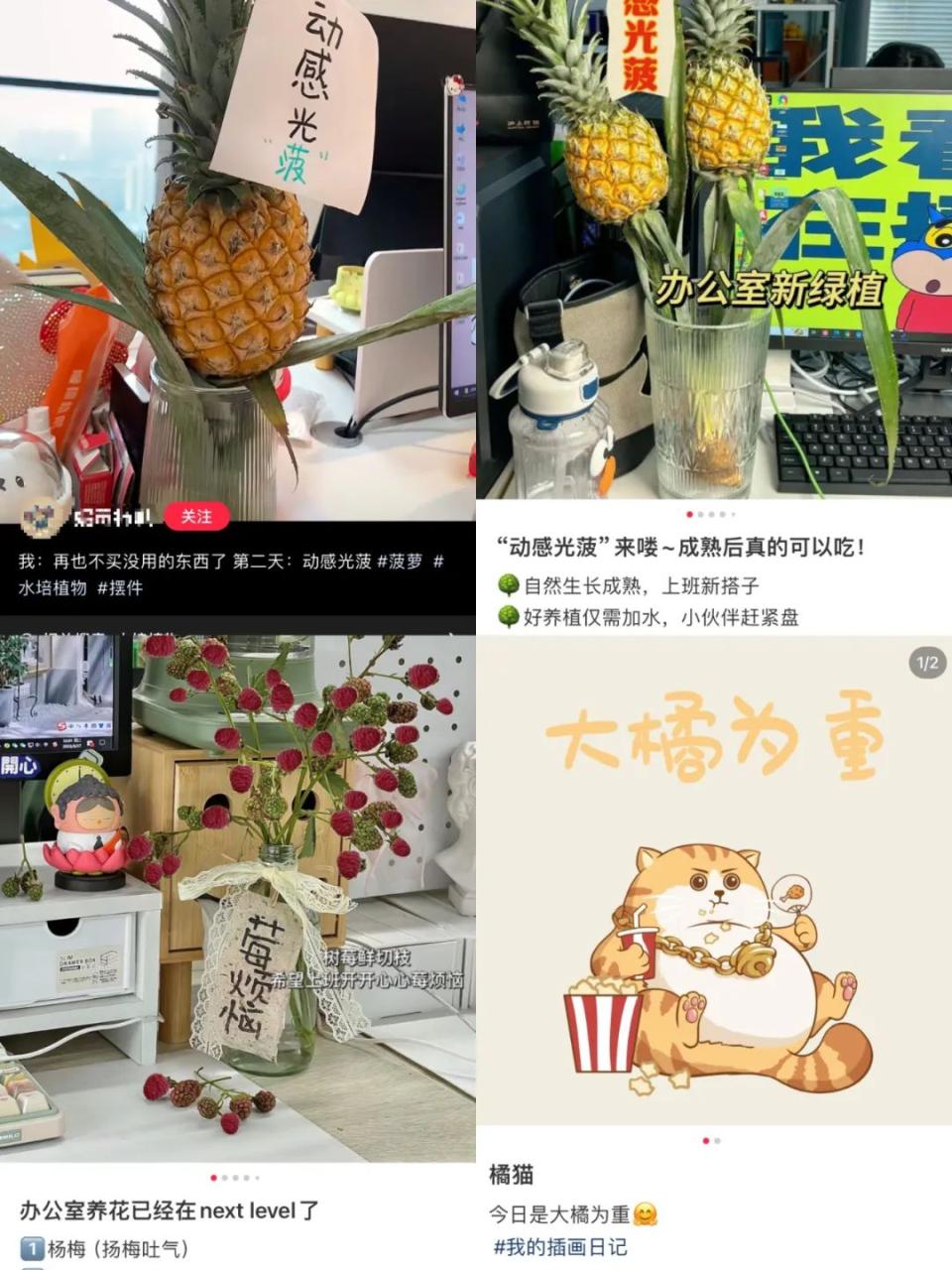 不仅如此,网友们还展现出了非凡的创造能力,挖掘出了更多拥有寓意美好的表达方法。与香蕉一起出道就是菠萝,被称为「动感光菠」,实际上就是水培菠萝;有着异曲同工之妙的还有,「莓烦恼」「大橘为重」「芒里偷闲」……这些蔬菜瓜果被打工人赋予了新含义而风靡市场,深受大众喜欢。