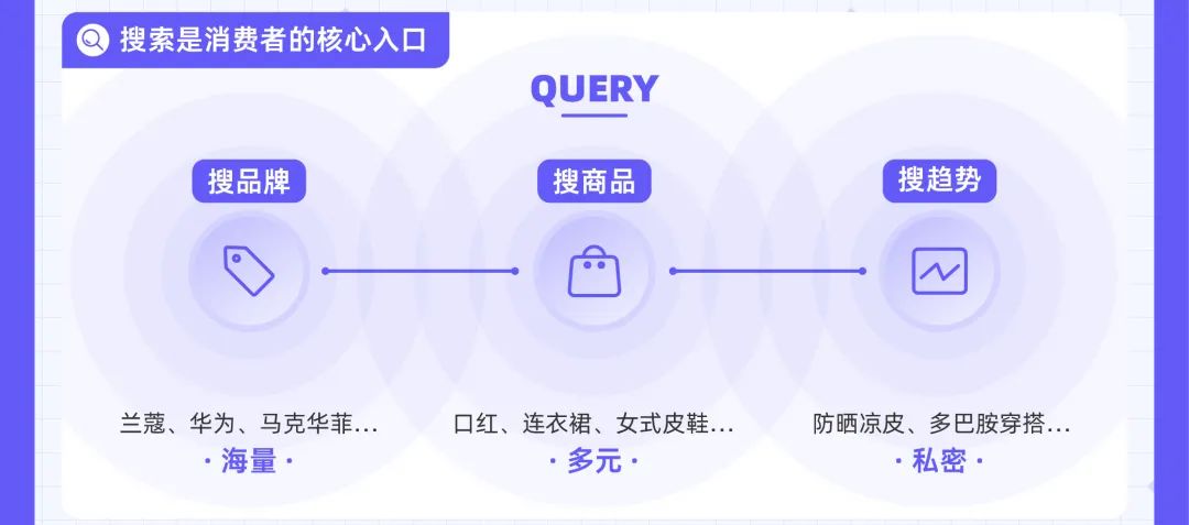 - 场方面,近几年可供搜索的线上平台也越来越多,平台也在助推趋势与热点营销,消费者搜索的场景和理由更细分,围绕消费决策由浅入深,诸如查看种草商品、常态化比价、研判市场风评、围绕消费计划做攻略等等;