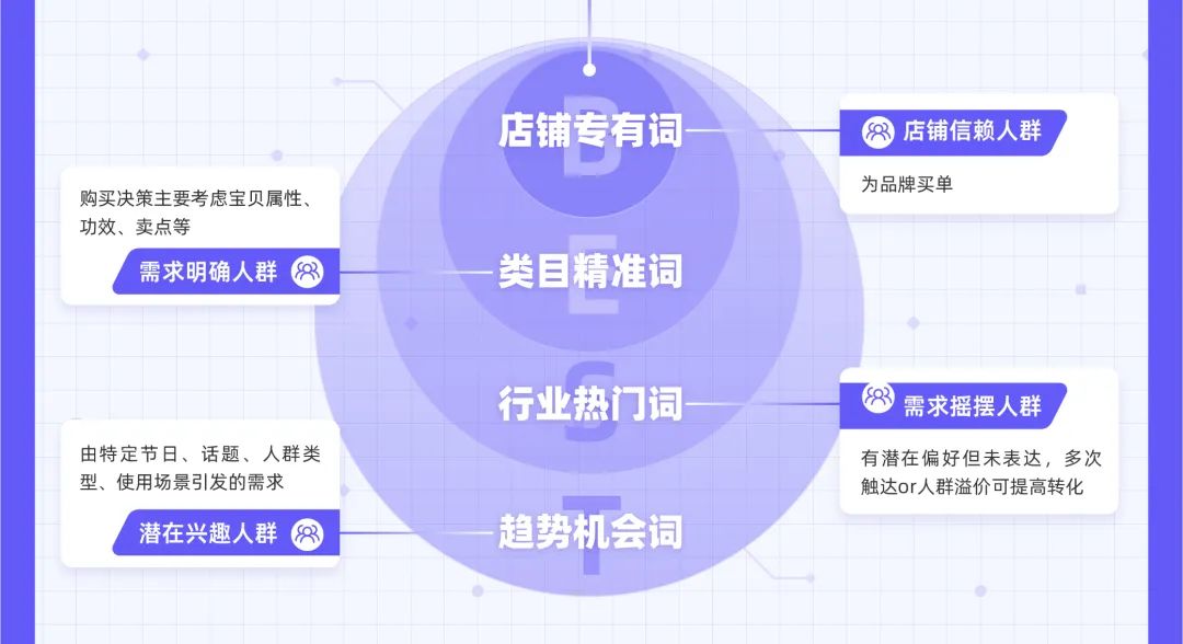按照与店铺生意由近及远的关系,阿里妈妈将搜索关键词梳理为B-Brand words店铺专有词、E-Exact words类目精准词、S-hot Searches行业热门词、T-Trend words趋势机会词四环。