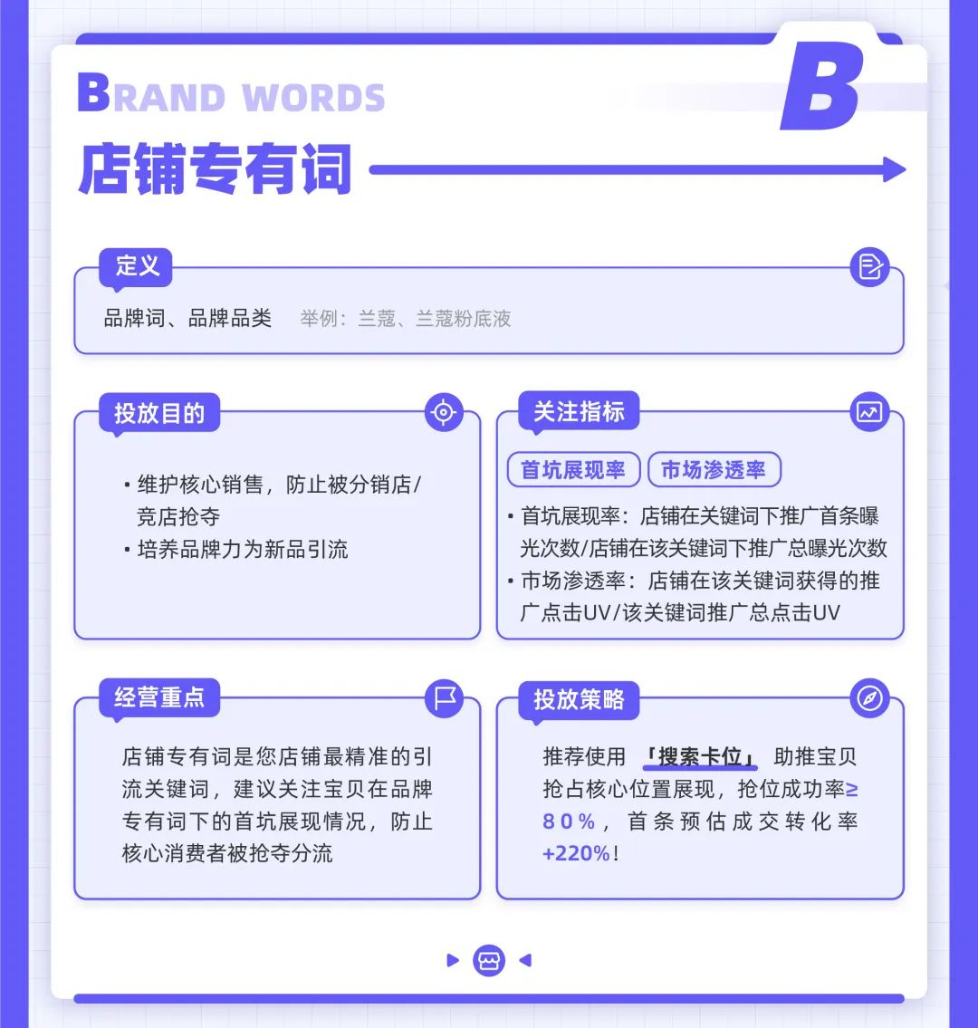 具体而言,BEST方法论的四分层也有各自适用的商家类型、经营重点、投放策略、评估指标,阿里妈妈还为之提供了相匹配的搜索词卡产品,帮助商家截获流量,打爆商品: