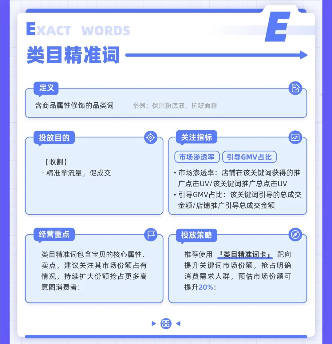 经营重点在于,关注商品的核心卖点和市占情况。商家可以使用「类目精准词卡」靶向提升关键词的市场份额,预估市场份额可提升20%;投放后,还可以通过市场渗透率、引导GMV占比追踪优化。
