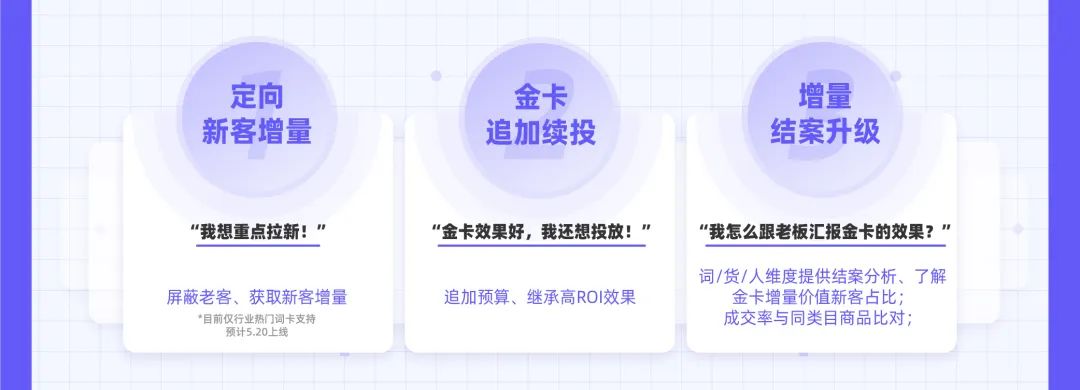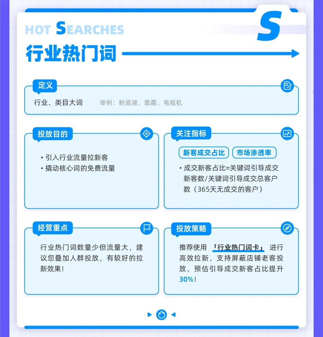 经营重点在于,可以叠加人群投放,有更直观的拉新效果。商家可以使用「行业热门词卡」,支持屏蔽店铺老客,引导成交的新客占比可提升30%;投放后,可关注新客成交占比、市场渗透率等优化指标。