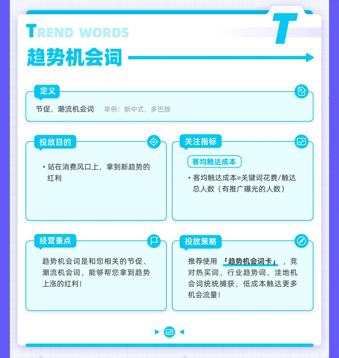 经营重点在于及时且全面地掌握消费趋势下的潮流新词,商家可以使用「趋势机会词卡」一键捕获竞对热买词、行业趋势词、洼地机会词,在有效提升触达人数的同时,降低投后关注客均触达成本等指标!