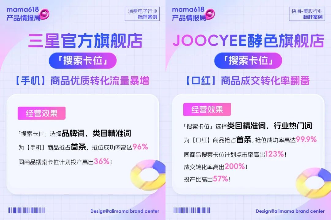 例如三星为手机商品抢占首条,抢位成功率高达96%,JOOCYEE酵色为口红商品抢占首条,抢位成功率高达99.9%。