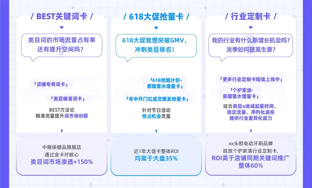 比如现已对个护家清行业推出的前瞻蓄水增量卡,某头部电动牙刷品牌在投放该卡后,ROI高于店铺同期关键词推广整体60%。