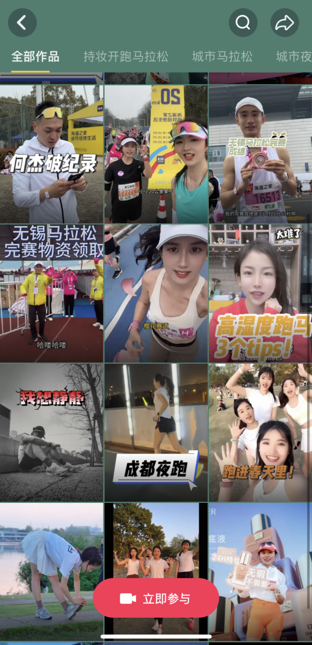 跑步,不仅可以是一人自嗨,还可以是一群人的狂欢。此次【人生热爱之城市开跑计划】营销IP启动初期,抖音便邀请了@游不动的小明、@程鸣、@爱跑步的李老师、@法海来了、@王丽萍竞走奥运冠军五位运动领域的优质KOL作为城市开跑启动官,在他们的号召和平台奖励下,站内用户踊跃参与活动,在话题页中积极分享自己运动中的精彩瞬间和心路历程,点燃了大众对此次活动的关注和热情。
