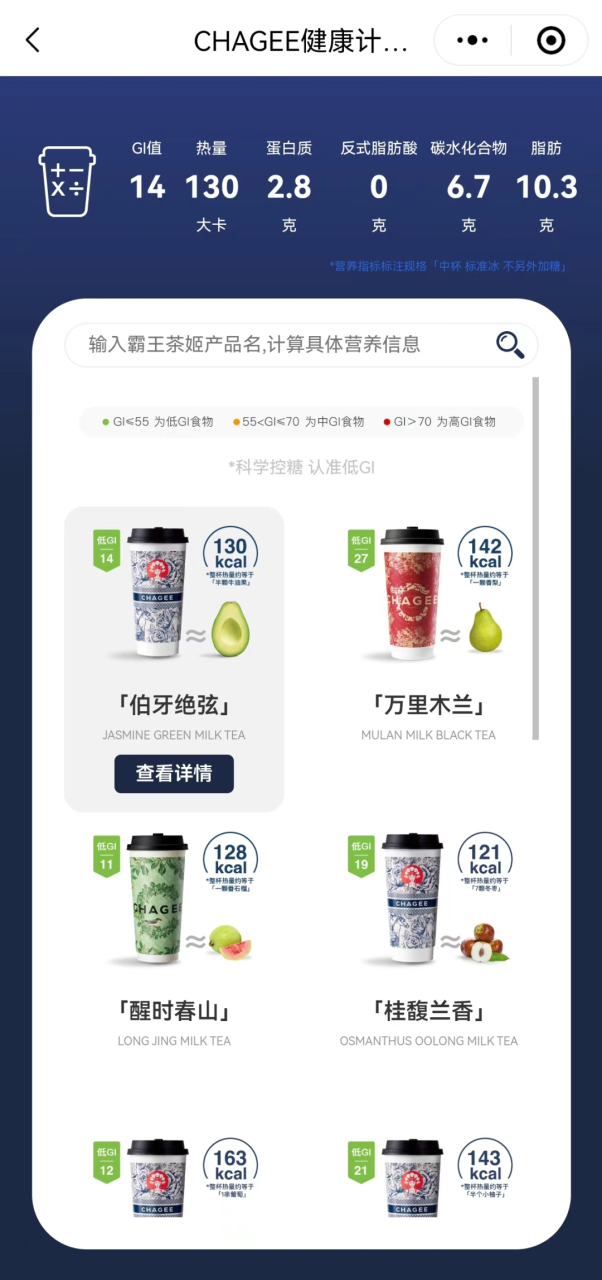 为了让产品的健康变得更加“可视化”,霸王茶姬在现制茶饮行业首创产品身份证、热量计算器,率先试行“营养选择标识”和“低GI标识”,成为行业首家公开展示产品热量值和营养成分的品牌,让消费者在购买产品的时候能够收获一份额外的情绪价值。很多人都是因为“一杯伯牙绝弦约等于半颗牛油果的热量”“伯牙绝弦升糖指数=14,小于猕猴桃”这类文案购买这款产品,心智影响效果可见一斑。