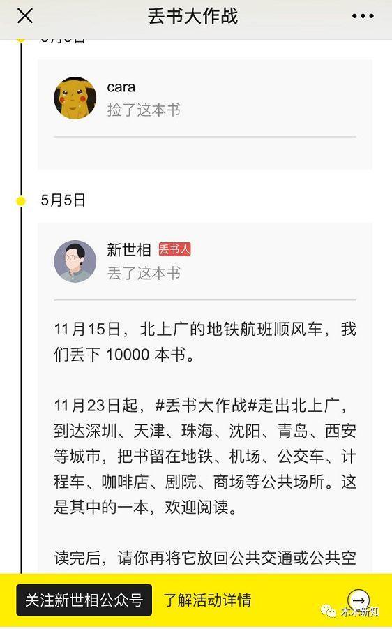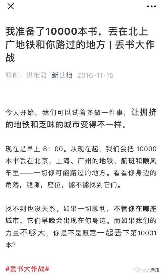 b. 微信公号推文《我准备了10000本书,丢在北上广地铁和你路过的地方》