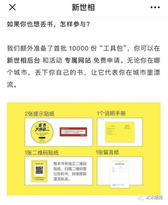 新世相为每个丢书人准备了免费工具包,包括宣传贴纸、书籍专属二维码、留言纸等,一方面,“丢书大作战”宣传贴纸起到活动整体宣传作用。