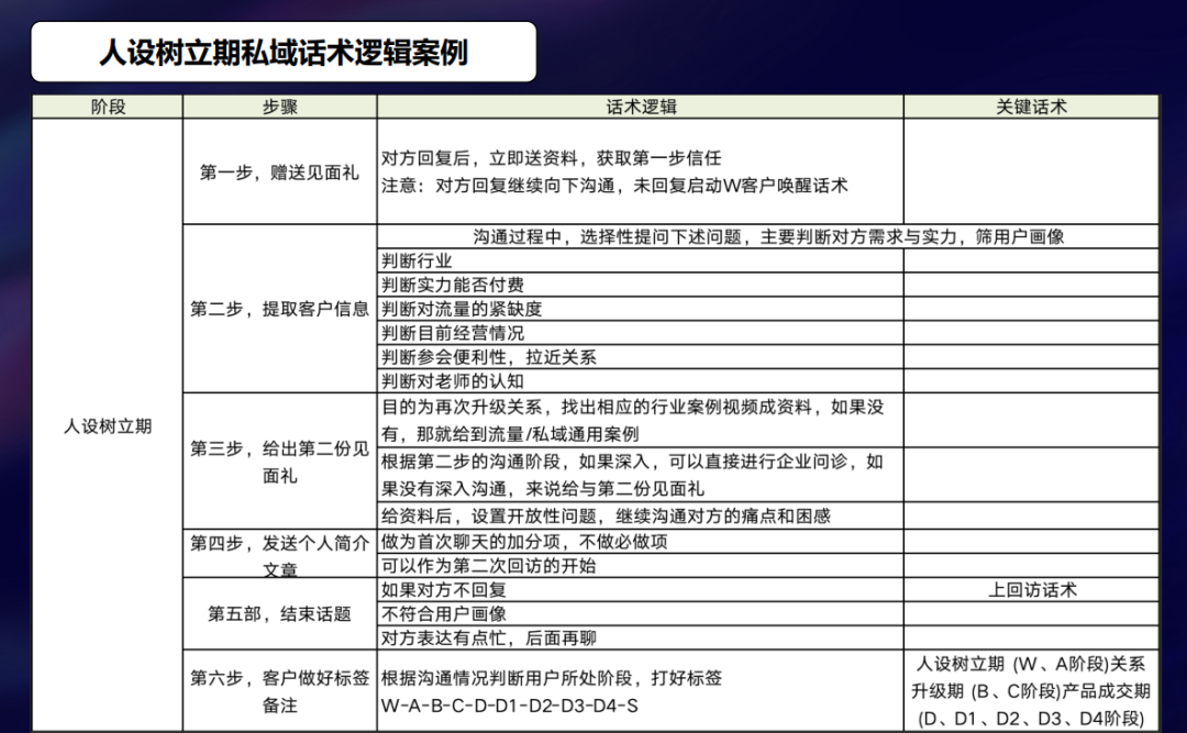 在人设树立期,要做到的核心步骤就是,用核心话术兑现钩子、提取添加的用户信息、发送IP简介让用户了解你、用能引发好感的话术作为结束语、最后,录入聊天过程种,客户披露的关键信息。