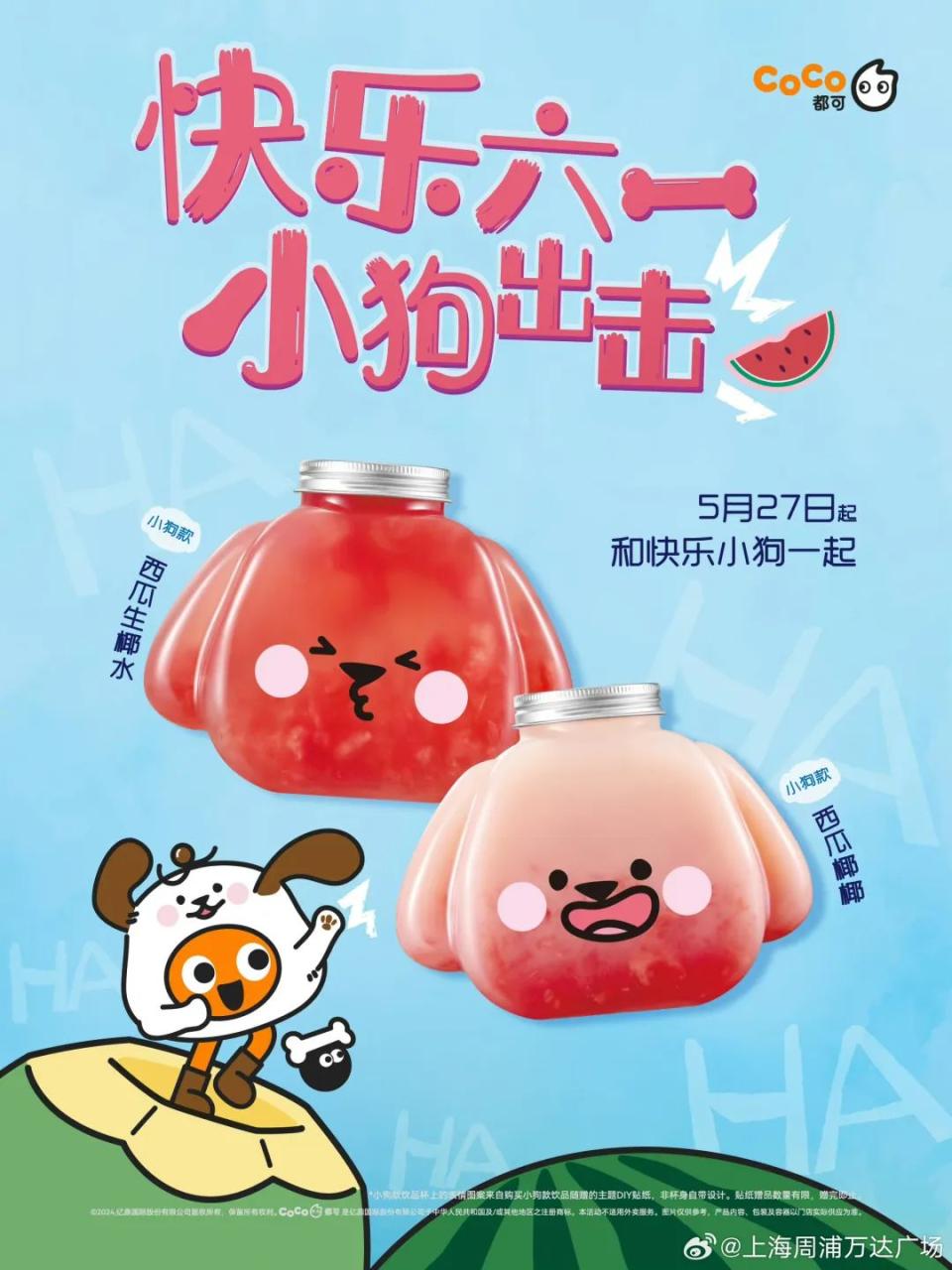 CoCo和快乐小狗联名了,喊出「快乐六一,小狗出击」的宣传口号,推出小狗款西瓜生椰水和西瓜椰椰联名新品。